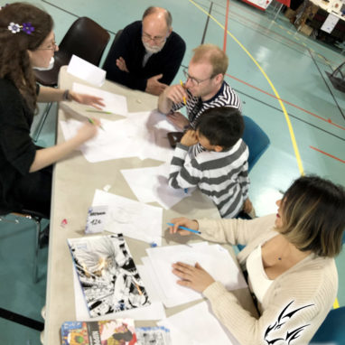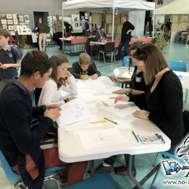 Le dimanche, nous avons donc animé l’atelier de dessin manga, en format “ouvert”, où les gens arrivaient et repartaient comme ils le souhaitaient. L’atelier a connu un beau succès ! Avec un démarrage lent, puisque qu’il y avait assez peu de public le dimanche matin, mais qui est arrivé en début d’après-midi et qui a duré jusqu’à la fermeture.