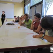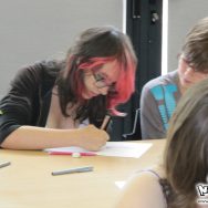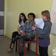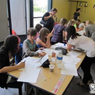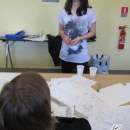 Par rapport au programme prévu initialement, et par rapport à la moyenne d’âge assez basse pour un atelier avancé, nous avons revu le niveau à la baisse. À la base, nous avions prévu de voir le matin la construction d’une histoire sur plusieurs tomes, mais nous avons préféré les faire travailler sur une histoire en one-shot d’une page seulement, afin de permettre aux plus jeunes de suivre. La matinée s’est donc déroulée sur un cours assez théorique, sur l’écriture d’un mini-scénarii qu’ils ont présenté chacun leur tour devant tout le monde, pour s’achever sur la création d’un personnage. certaines histoires étaient franchement très créatives, et très drôles ! Dans l’ensemble, il y avait de tout, tous les styles et tous les genres !