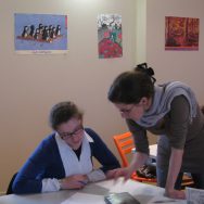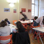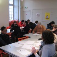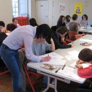 La première session a eu lieu de 10h à 12h et réservée à un public de 13 ans et plus, niveau débutant. Comme pour la session du 7 mars les tables et sièges étaient déjà installés. Nous étions fin prêts pour accueillir les participants, dont beaucoup étaient arrivés en avance ! La majorité des 17 participants était âgée de 13 ans / 17 ans, mais quelques adultes (et un retraité) se sont glissés dans le groupe. Les niveaux et les connaissances étaient hétérogènes mais l’ambiance studieuse, ce qui a permis à tous d’avancer et les intervenants de les conseiller individuellement. La médiathèque nous avait mis quelques shôjo et shônen mangas à disposition des participants manquant d’inspiration ! Nous étions tellement absorbés que l’atelier s’est terminé à 12h30 !