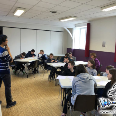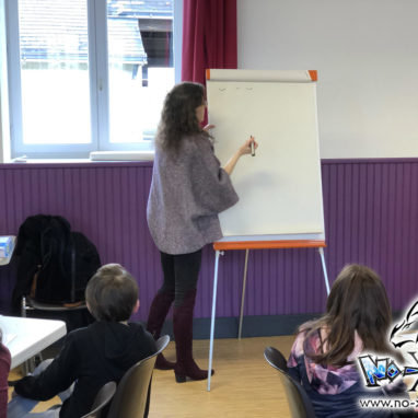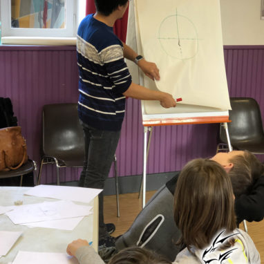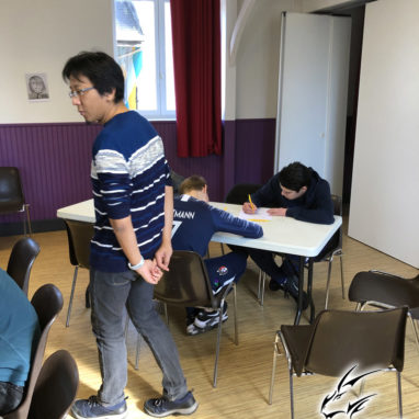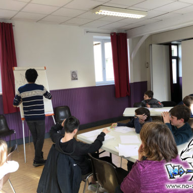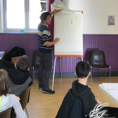 L’après-midi, c’est donc San Lee qui a lancé l’atelier, avec un groupe moins nombreux, 12 participants, plus la bibliothécaire, plus l’animatrice du foyer de jeunes (5 participants venaient du foyer de jeunes). De très bons résultats, et des participants vraiment motivés et intéressés ! Ayant avancé très vite sur le cours de base, nous avons même eu le temps de faire un autre exercice !