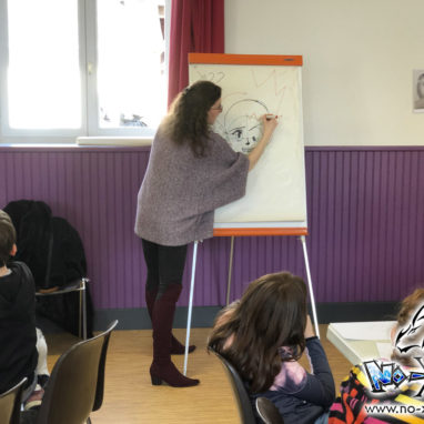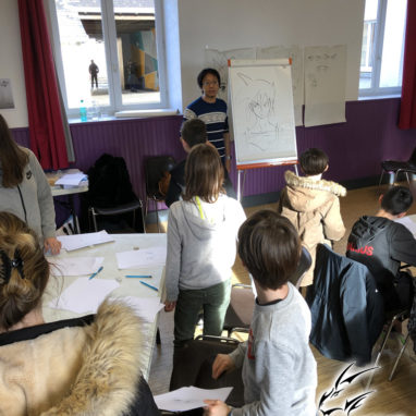 Le groupe du matin était le plus nombreux, avec 19 participants, et une majorité de filles. C’est donc Kômori qui a lancé cet atelier. Les enfants sont tous repartis avec un dessin réussi !