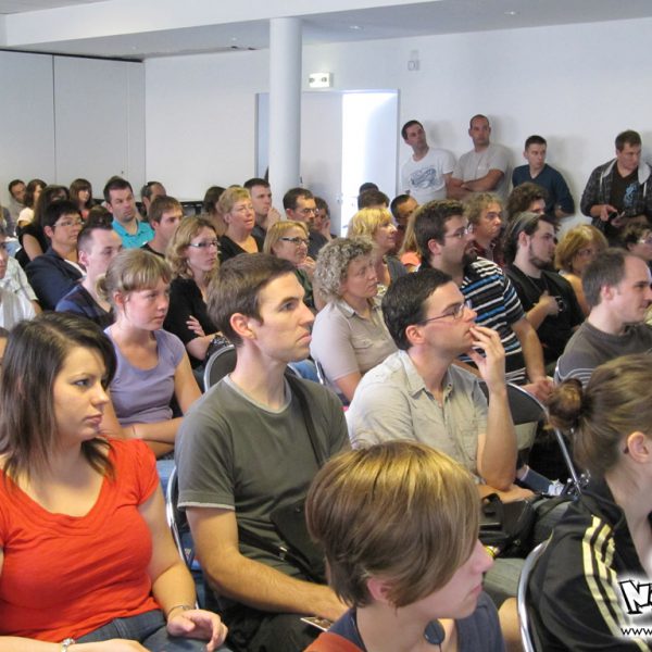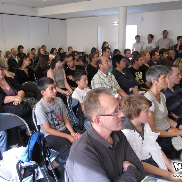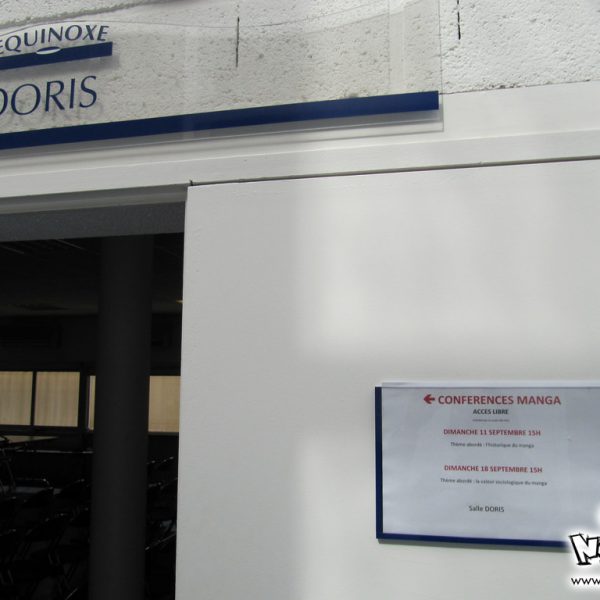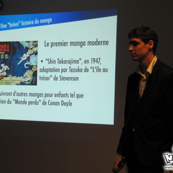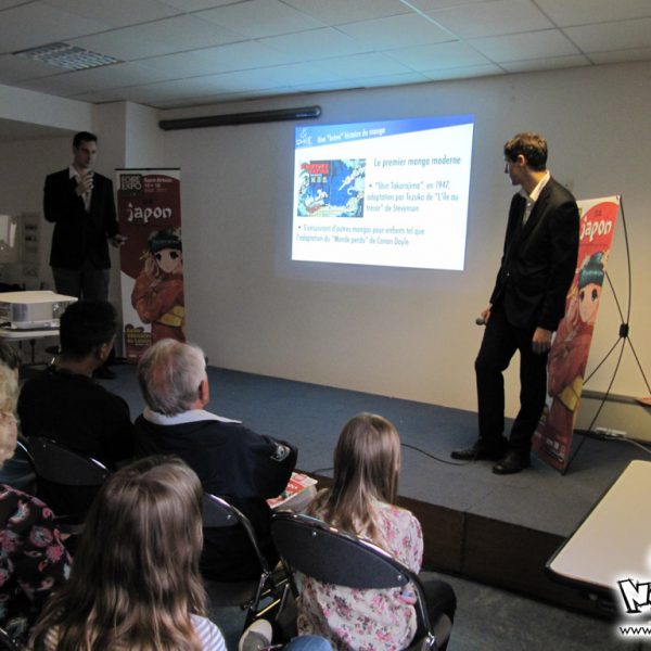 Cette conférence, présentée par Torog et Mopral, portait sur l’historique du manga. Elle débutait à 15h, et durant la demie-heure avant le début, 150 personnes sont venues remplir la salle de conférence.