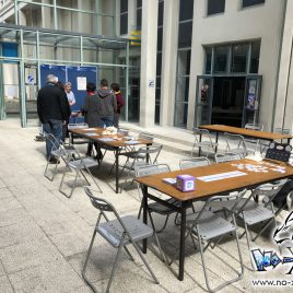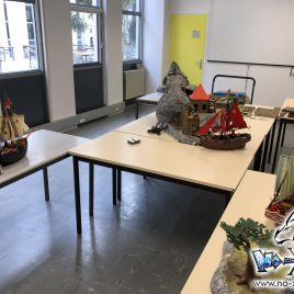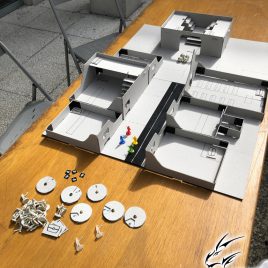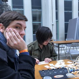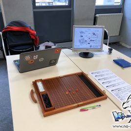 Une fois à l’intérieur, comme on connaît l’espace, on se repère facilement. Beaucoup de tables et chaises, beaucoup d’espaces de jeux, mais très très vide. Peu de gens, et peu de stands au final. Beaucoup de jeux en libre-service, ce qui est plutôt bien, et pas de souci pour s’installer où on veut. Assez peu de jeux en prototype malheureusement, environ 5, et assez mal finalisés.
