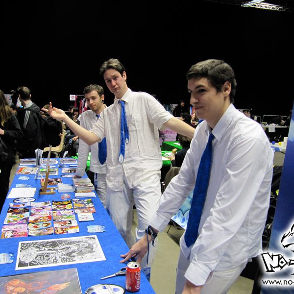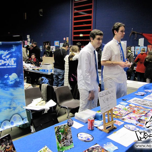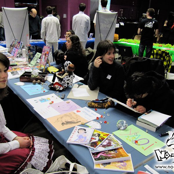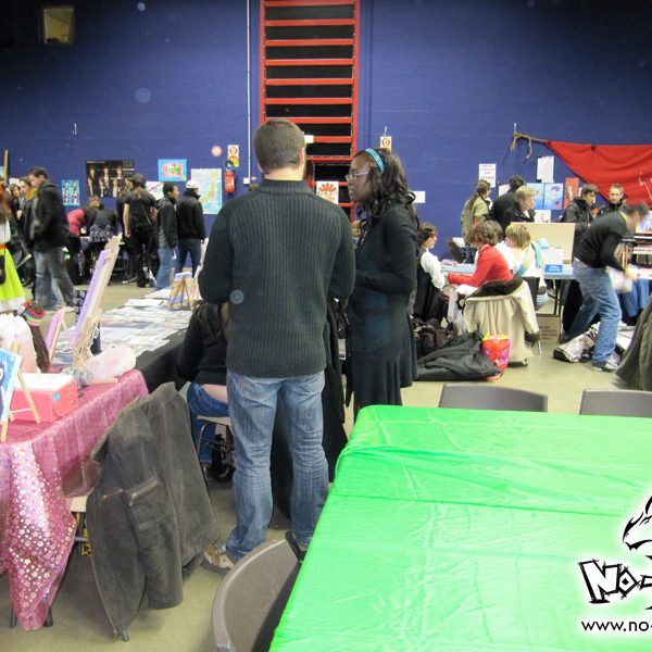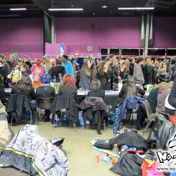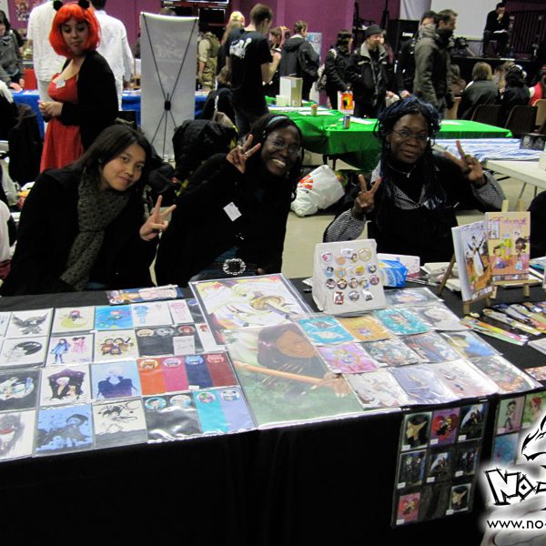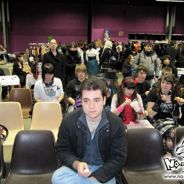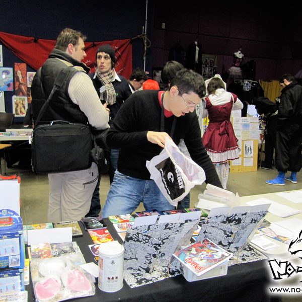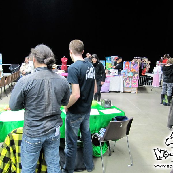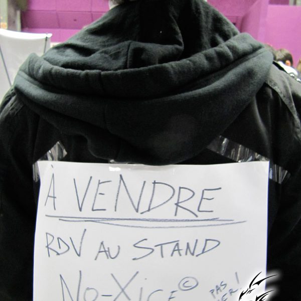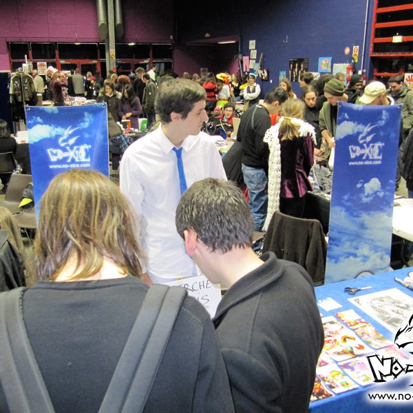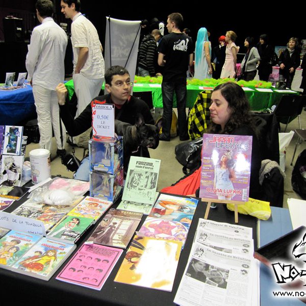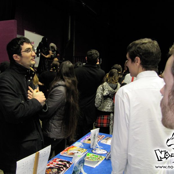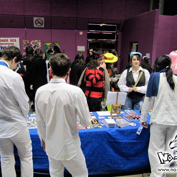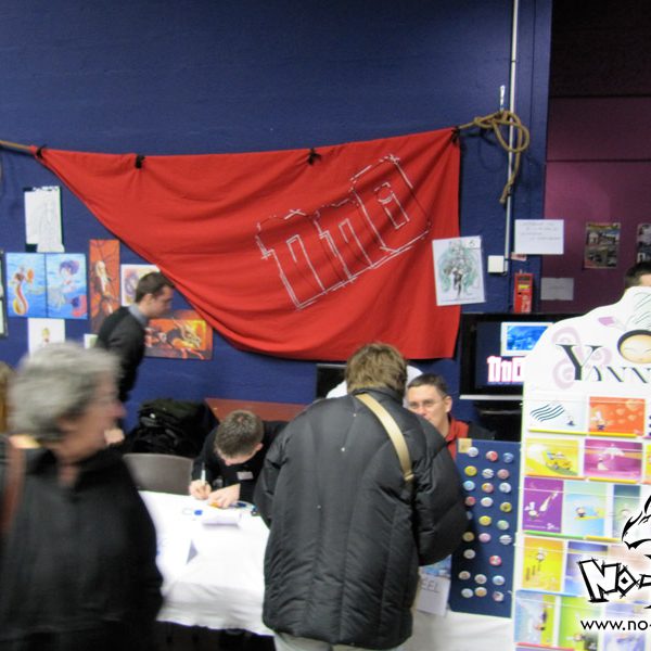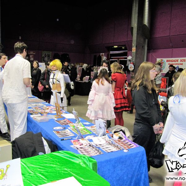 Le déroulement de la convention en elle-même a été une autre paire de manche : les organisateurs ayant prévu 1000 visites sur les deux jours, la salle s’est rapidement comblé le premier jour et la circulation devenait très difficile à proximité de la scène (et de notre stand donc), voire même quasi-impossible ! Du coup, les gens stagnaient sur place, et ne passaient plus devant les stands… La scène était trop petite, avec seulement trois rangées de chaises devant, et elle donnait directement sur une des allées, d’où les bouchons. Les stands de fanzines du centre de la convention étaient disposés en carré ; cet agencement paraît attractif, mais au final, il fait perdre de la place et pose des problèmes au niveaux des chaises et de l’arrière du stand. Sans compter que nous n’avions pas de panneaux d’affichage derrière nous, et que du coup, la “déco” centrale du carré était composée des sacs poubelles des stands No-Xice©, Wazabi, Méluzine, le Triangle des Bermudas et Eclectick… Un agencement de stands dos à dos auraient sans doute été plus judicieux, et aurait permis de créer une allée supplémentaire qui aurait été très utile au moment des grandes affluences.