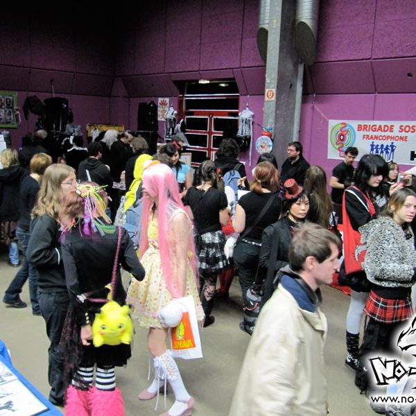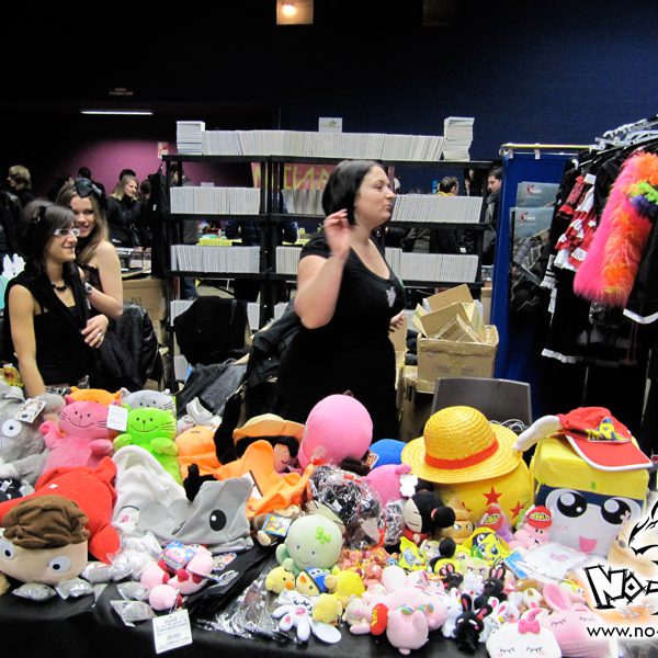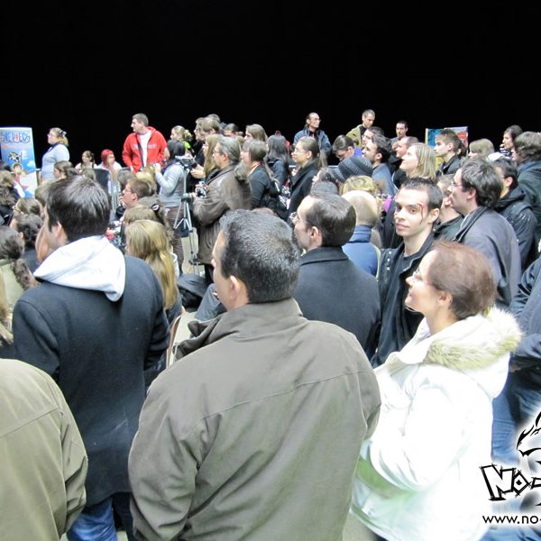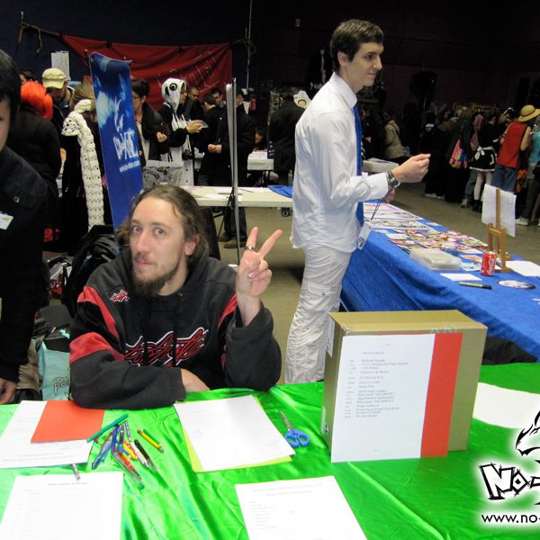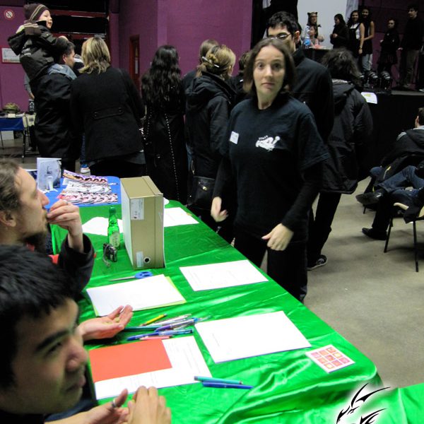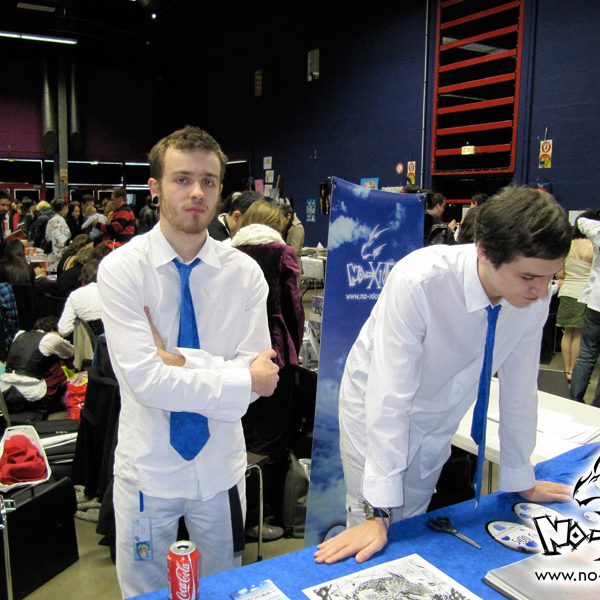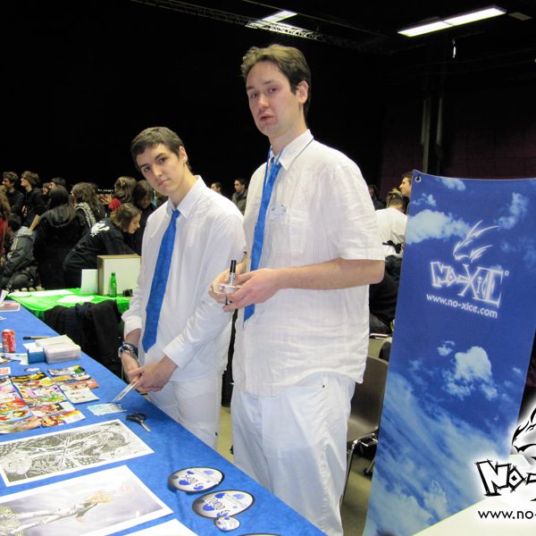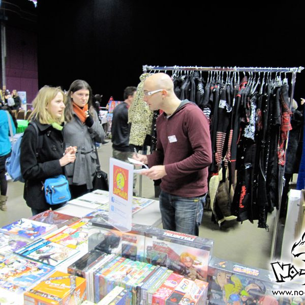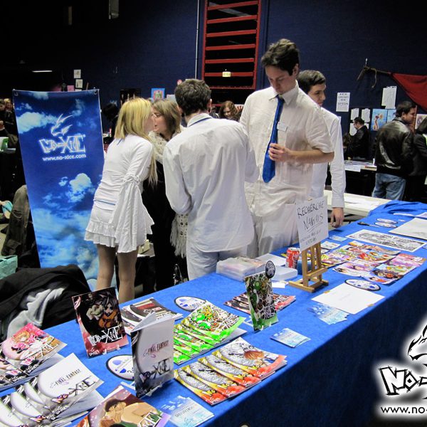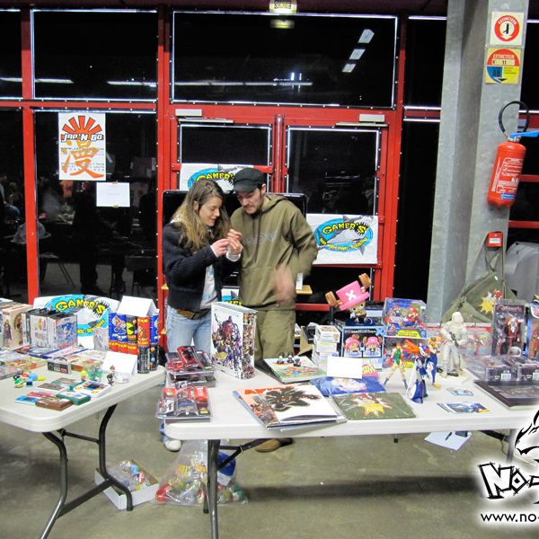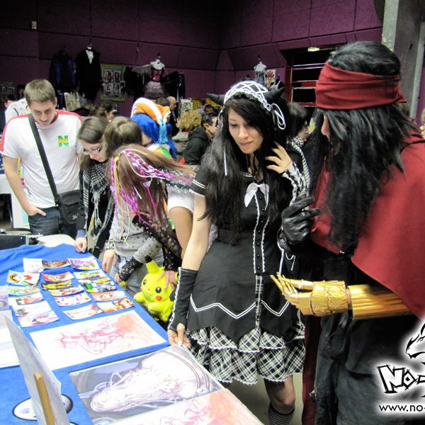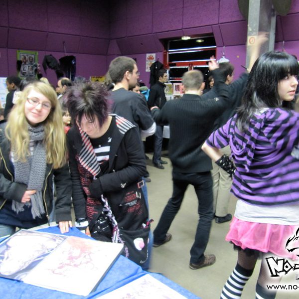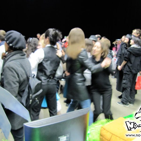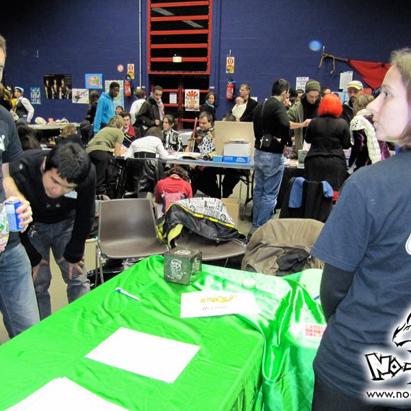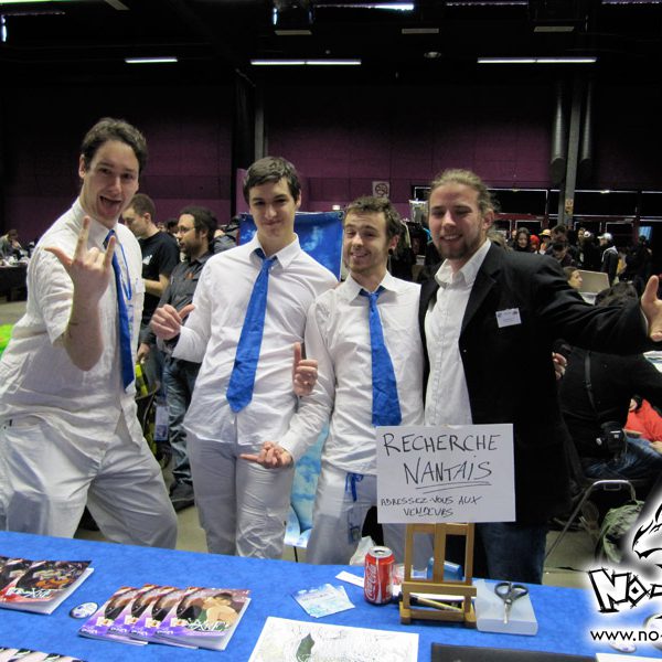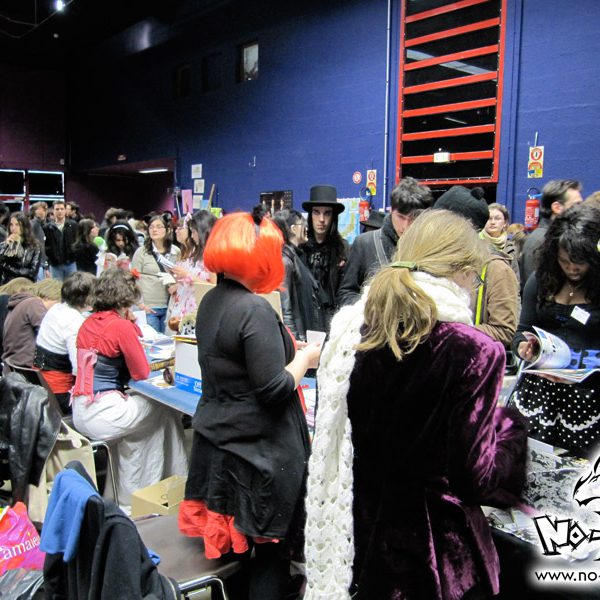 Le déroulement de la convention en elle-même a été une autre paire de manche : les organisateurs ayant prévu 1000 visites sur les deux jours, la salle s’est rapidement comblé le premier jour et la circulation devenait très difficile à proximité de la scène (et de notre stand donc), voire même quasi-impossible ! Du coup, les gens stagnaient sur place, et ne passaient plus devant les stands… La scène était trop petite, avec seulement trois rangées de chaises devant, et elle donnait directement sur une des allées, d’où les bouchons. Les stands de fanzines du centre de la convention étaient disposés en carré ; cet agencement paraît attractif, mais au final, il fait perdre de la place et pose des problèmes au niveaux des chaises et de l’arrière du stand. Sans compter que nous n’avions pas de panneaux d’affichage derrière nous, et que du coup, la “déco” centrale du carré était composée des sacs poubelles des stands No-Xice©, Wazabi, Méluzine, le Triangle des Bermudas et Eclectick… Un agencement de stands dos à dos auraient sans doute été plus judicieux, et aurait permis de créer une allée supplémentaire qui aurait été très utile au moment des grandes affluences.