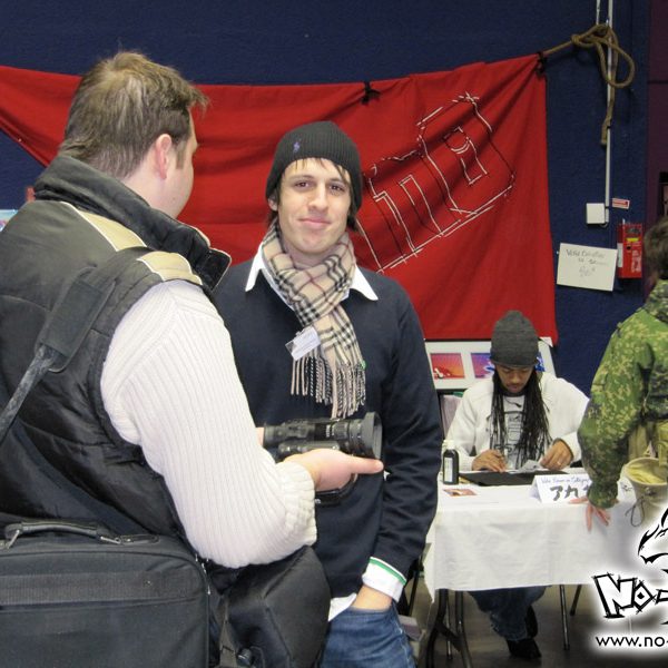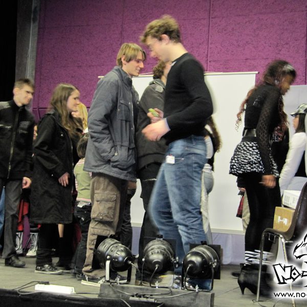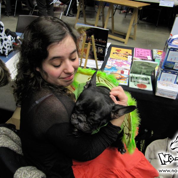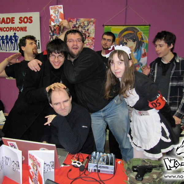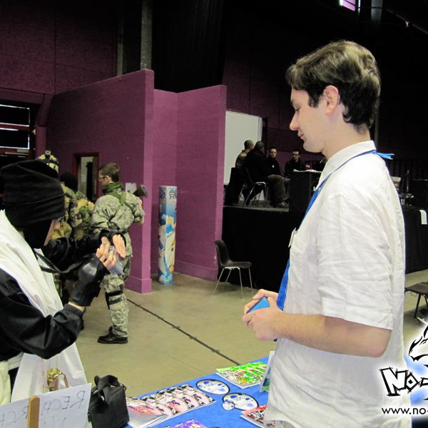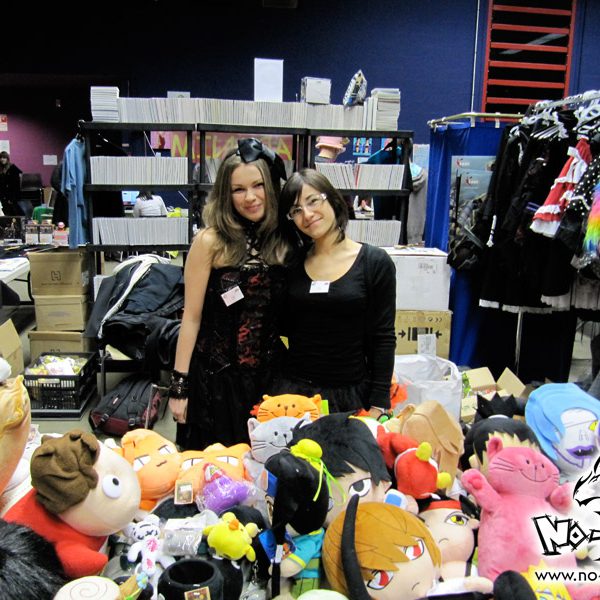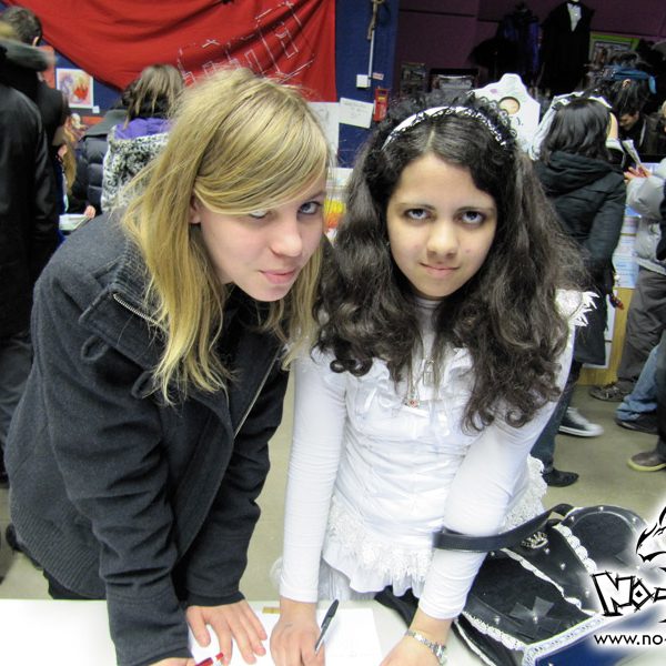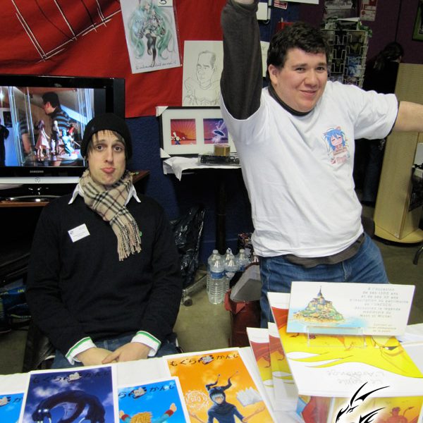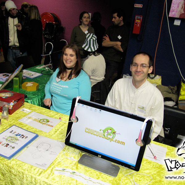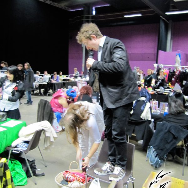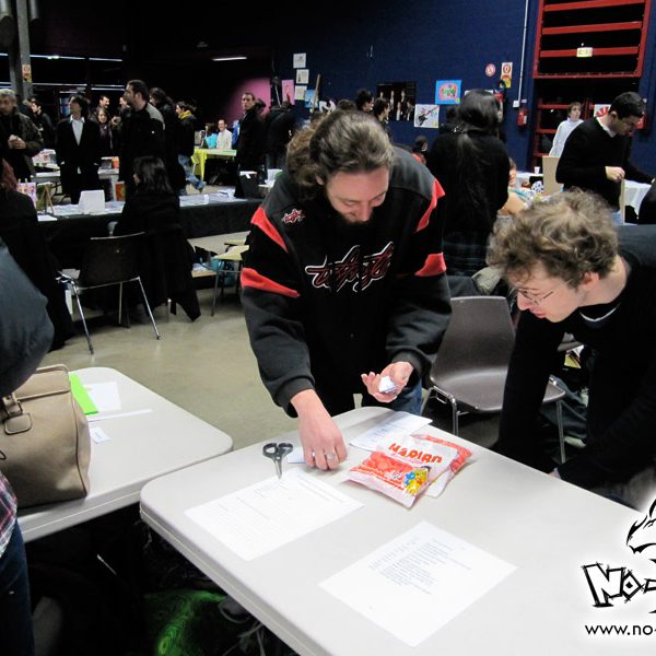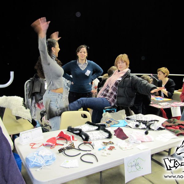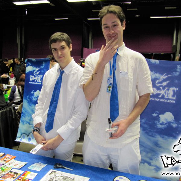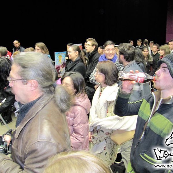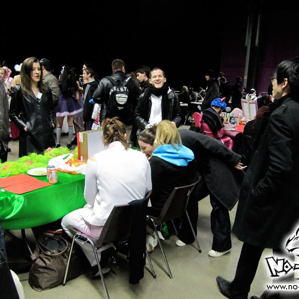 Le déroulement de la convention en elle-même a été une autre paire de manche : les organisateurs ayant prévu 1000 visites sur les deux jours, la salle s’est rapidement comblé le premier jour et la circulation devenait très difficile à proximité de la scène (et de notre stand donc), voire même quasi-impossible ! Du coup, les gens stagnaient sur place, et ne passaient plus devant les stands… La scène était trop petite, avec seulement trois rangées de chaises devant, et elle donnait directement sur une des allées, d’où les bouchons. Les stands de fanzines du centre de la convention étaient disposés en carré ; cet agencement paraît attractif, mais au final, il fait perdre de la place et pose des problèmes au niveaux des chaises et de l’arrière du stand. Sans compter que nous n’avions pas de panneaux d’affichage derrière nous, et que du coup, la “déco” centrale du carré était composée des sacs poubelles des stands No-Xice©, Wazabi, Méluzine, le Triangle des Bermudas et Eclectick… Un agencement de stands dos à dos auraient sans doute été plus judicieux, et aurait permis de créer une allée supplémentaire qui aurait été très utile au moment des grandes affluences.