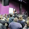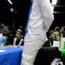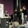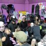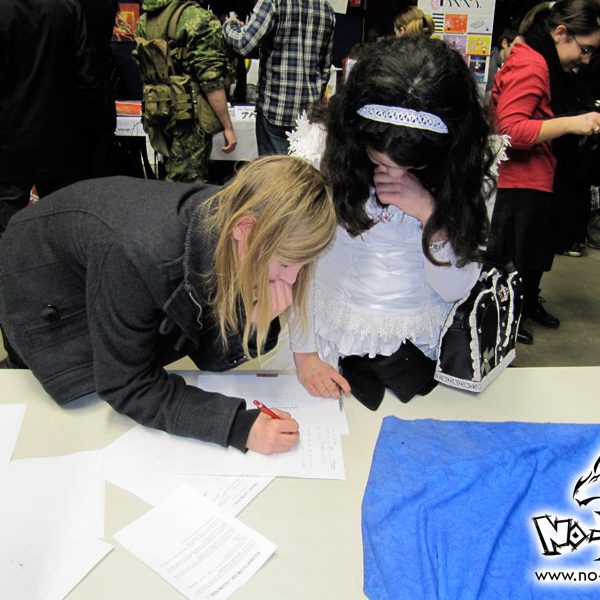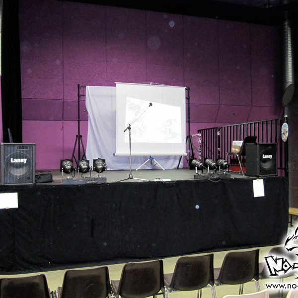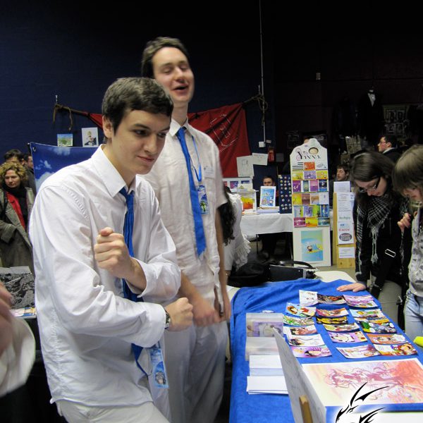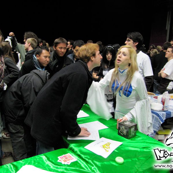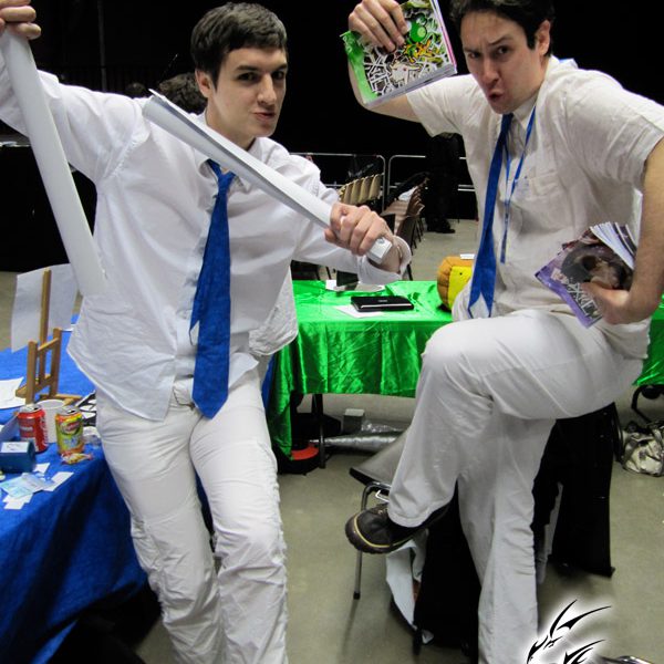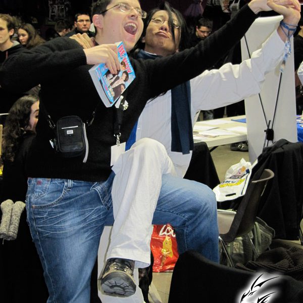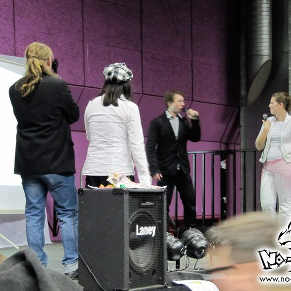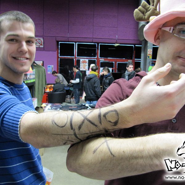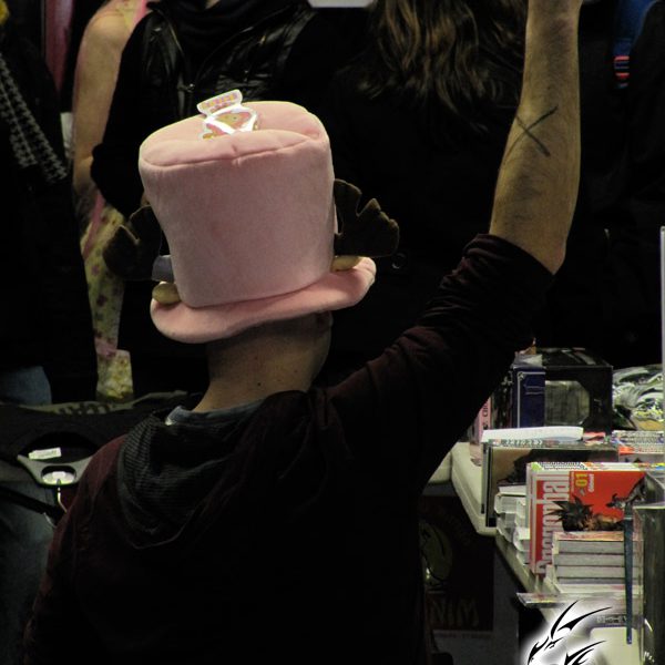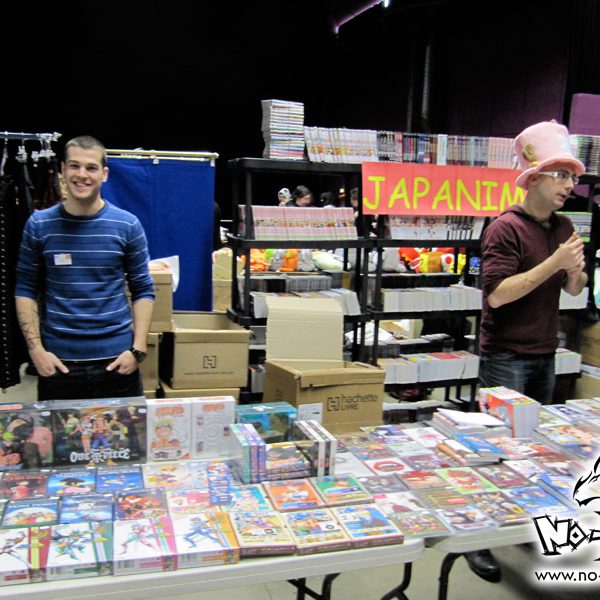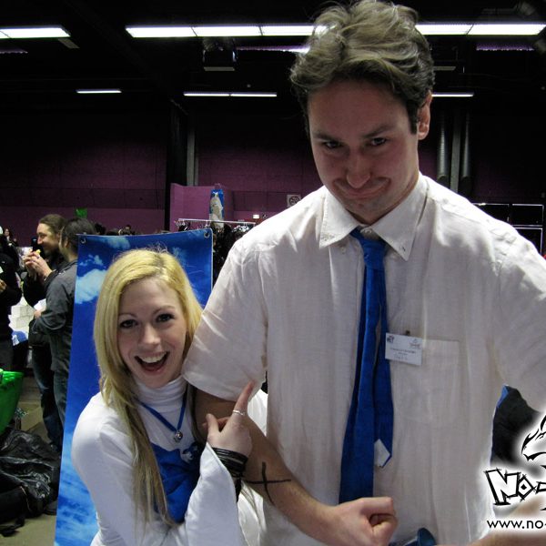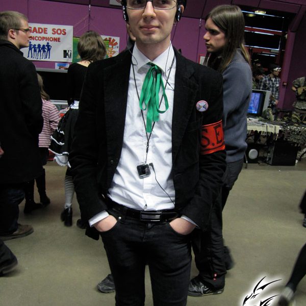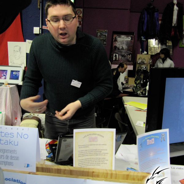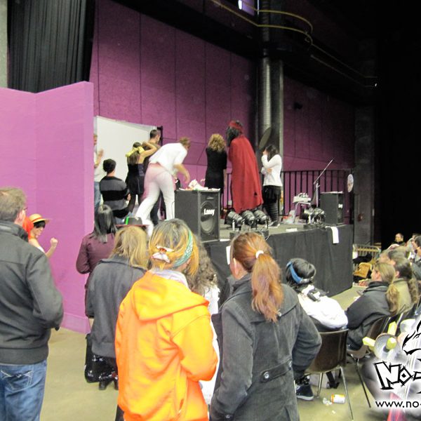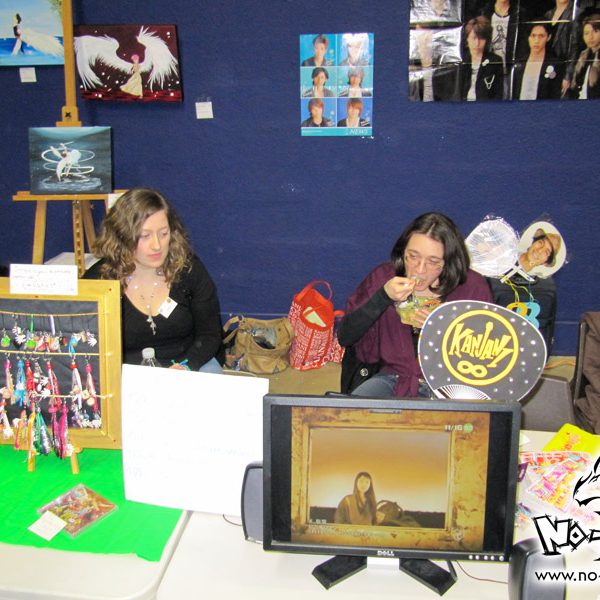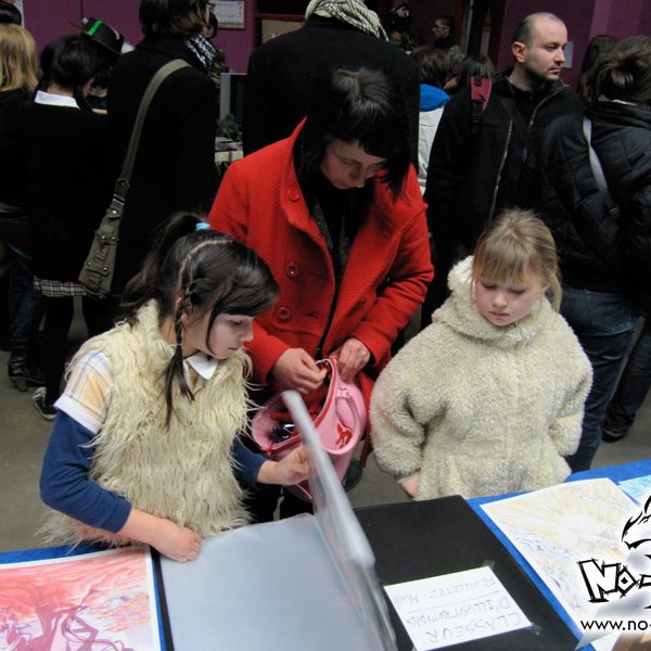 Le déroulement de la convention en elle-même a été une autre paire de manche : les organisateurs ayant prévu 1000 visites sur les deux jours, la salle s’est rapidement comblé le premier jour et la circulation devenait très difficile à proximité de la scène (et de notre stand donc), voire même quasi-impossible ! Du coup, les gens stagnaient sur place, et ne passaient plus devant les stands… La scène était trop petite, avec seulement trois rangées de chaises devant, et elle donnait directement sur une des allées, d’où les bouchons. Les stands de fanzines du centre de la convention étaient disposés en carré ; cet agencement paraît attractif, mais au final, il fait perdre de la place et pose des problèmes au niveaux des chaises et de l’arrière du stand. Sans compter que nous n’avions pas de panneaux d’affichage derrière nous, et que du coup, la “déco” centrale du carré était composée des sacs poubelles des stands No-Xice©, Wazabi, Méluzine, le Triangle des Bermudas et Eclectick… Un agencement de stands dos à dos auraient sans doute été plus judicieux, et aurait permis de créer une allée supplémentaire qui aurait été très utile au moment des grandes affluences.