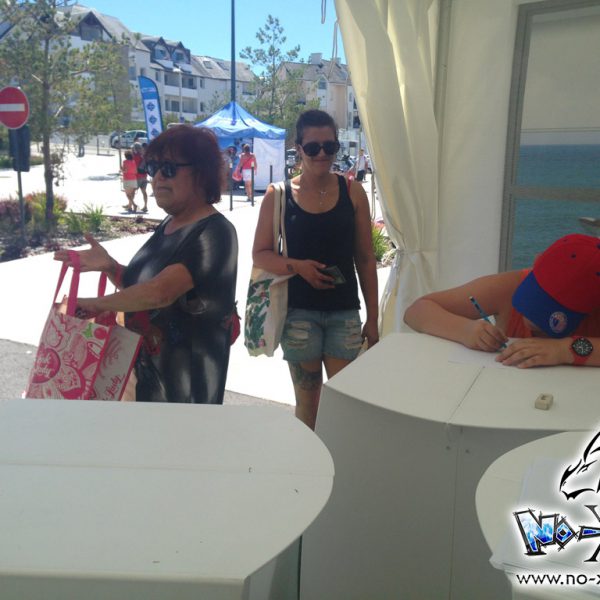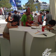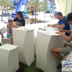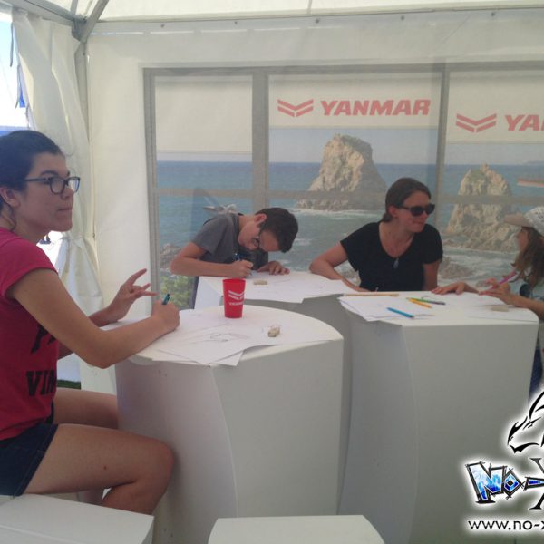 L’espace initiation manga était donc composé de 3 petites tables hautes, accompagnées de tabourets haut en plastique assez casse-gueule ; c’était le point négatif on va dire. Pour le reste, beaucoup de passage, et beaucoup de participants ! Le stand Yanmar ouvrait à 11h le matin : les gens faisaient la queue pour avoir leur photo, puis certains venaient directement ensuite pour l’atelier manga ! Un rythme assez soutenu toute la journée donc. Au final, une réussite puisqu’un certain nombre de participants sont revenus le lendemain pour refaire l’atelier ! Deux jours assez fatiguant, pour enchaîner après avec l’atelier aux Sables d’Olonne…