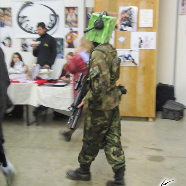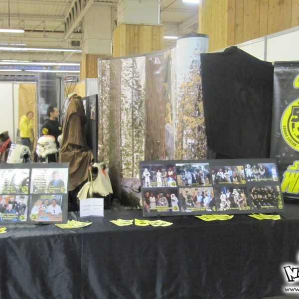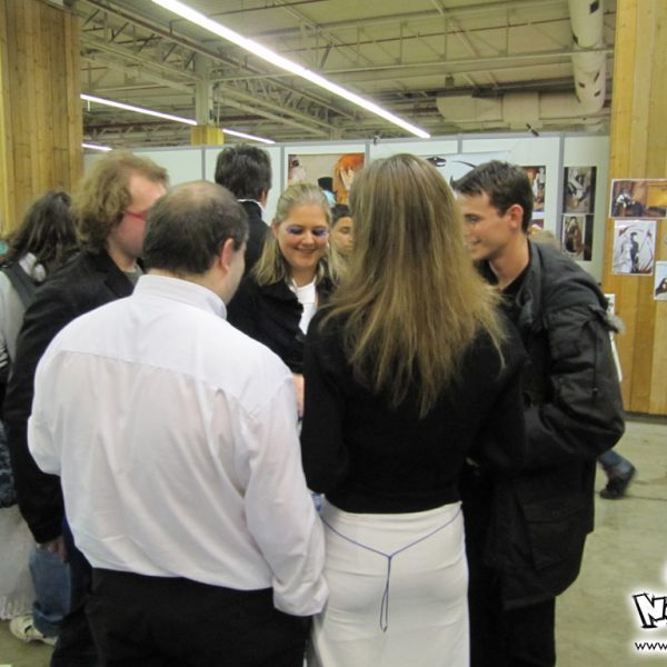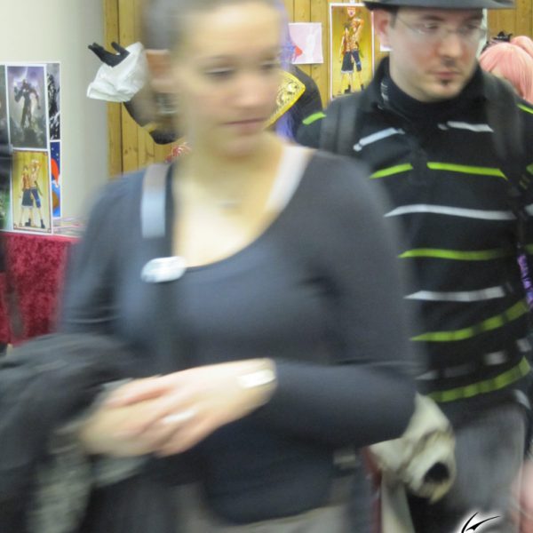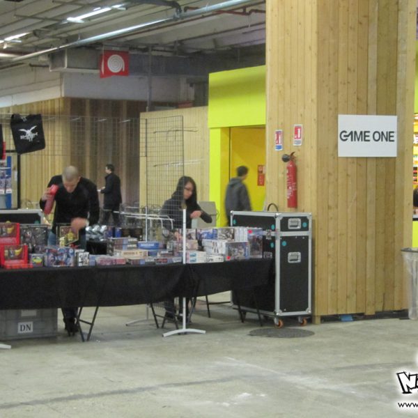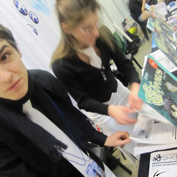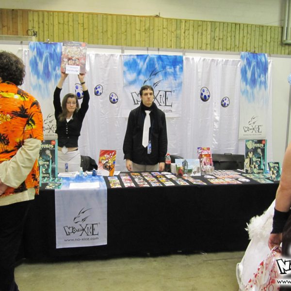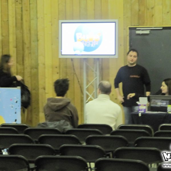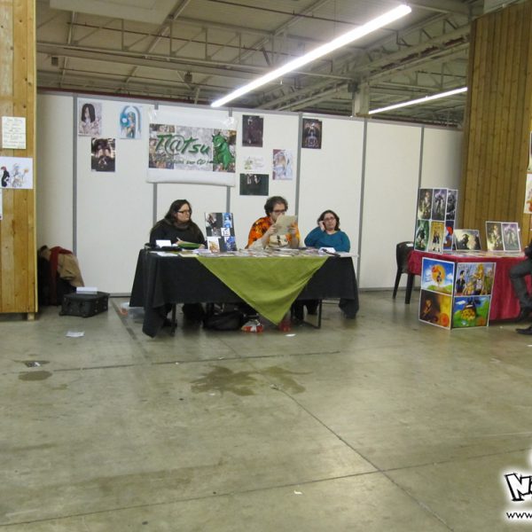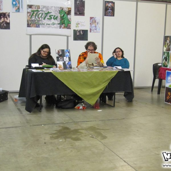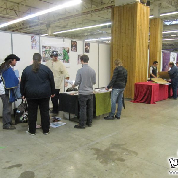 La convention a quand même connu des problèmes assez flagrant, notamment au niveau des amateurs cette année. L’entrée des amateurs étaient gérée par Gérald de Méluzine : aucun problème avec l’entrée donc, badges fournis rapidement, et connaissant bien les lieux, inutile de nous guider jusqu’à notre stand… Sauf que voilà, arrivés dans notre allée : toute la numérotation des stands est mauvaise ! Même si on se doutait de notre emplacement, demi-tour à l’accueil amateur pour prévenir du problème. Seulement 2 chaises à notre stand au lieu des 4 prévues ; un double stand en face de nous est accollé à un gros poteau, perdant quasiment deux tiers de sa surface ; le stand d’une table de T@tsu, juste en face de nous, est esseulé entre deux poteaux, ce qui fait un peu une impression de vide. Nous avons donc eu un Gérald le samedi qui courrait pour rétablir tout ça, avec nos voisins de droite qui ne sont jamais venus, et dont la table a été re-dispatchée… Bref, pas mal de cafouillage de ce point de vue là.