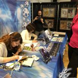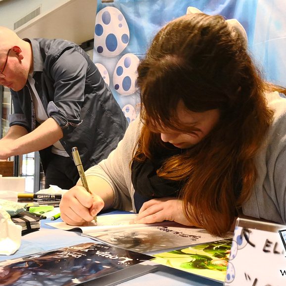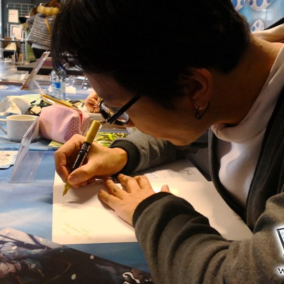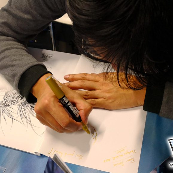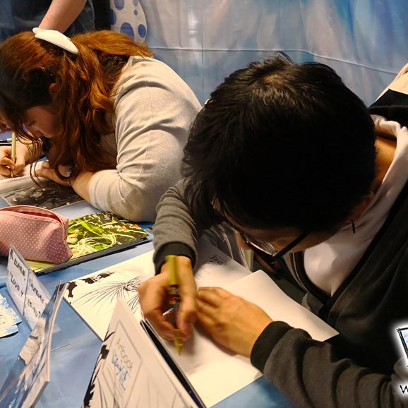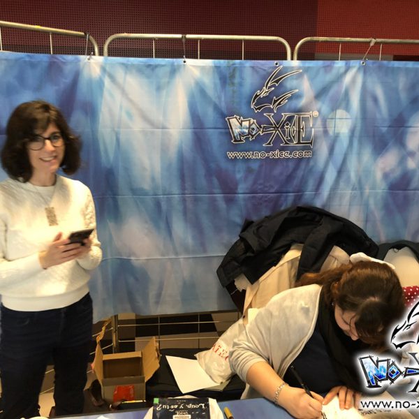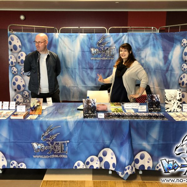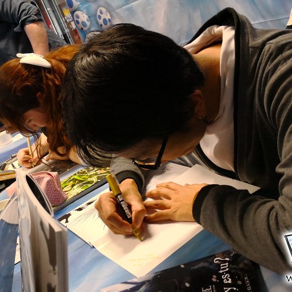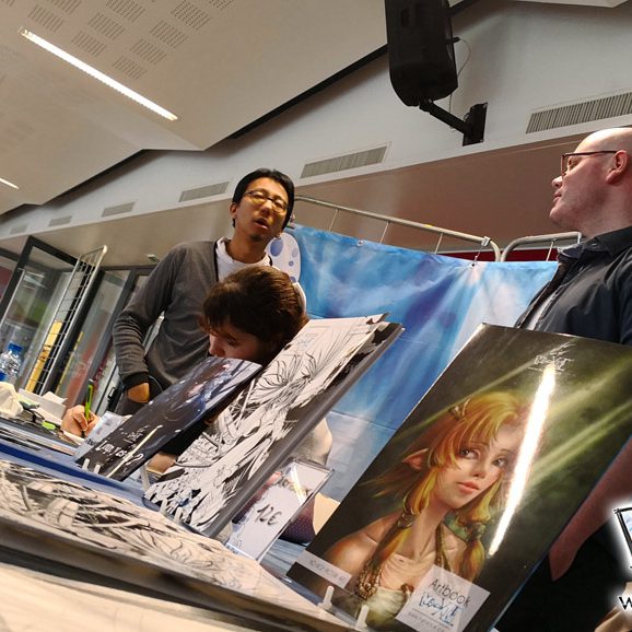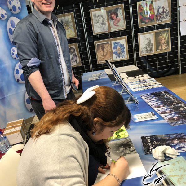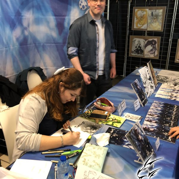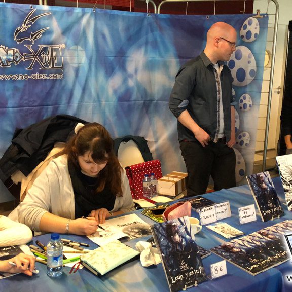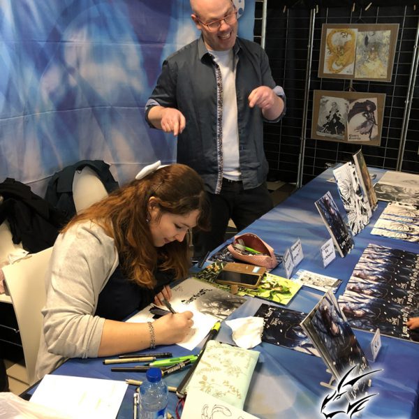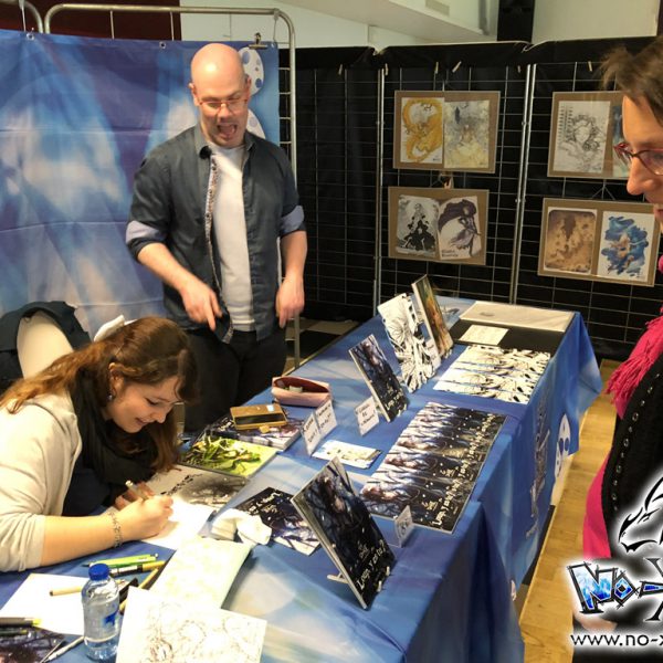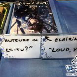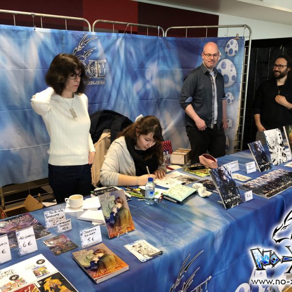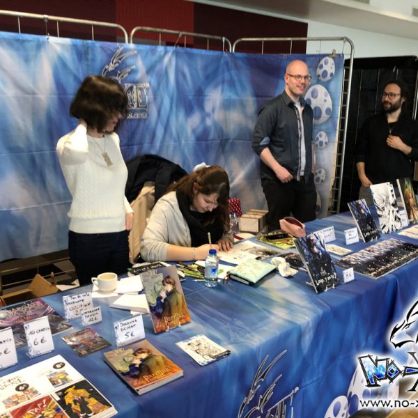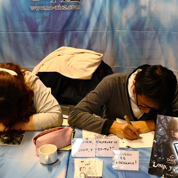 Derrière notre stand : San Lee, Kronk, et Elairin qui était là pour dédicacer son manga Loup y es-tu ?… Et on peut dire qu’elle n’a pas chômé ! La pauvre n’a pas levé le nez de 14h30 à 18h ! Elle a dédicacé non-stop pendant 3h30 ! Un beau succès pour elle ! Même si elle n’a pas vu grand-chose du salon du coup ! Et une visite (plus ou moins) surprise de Saisei, accompagnée de Guigw !