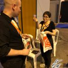 On prend donc nos badges à l’entrée (je reconnais qu’on ne fait pas forcément les choses dans l’ordre quand on arrive en conv ! ^^’ ), et on essaye de “chopper du staff”. On finit par en attraper un, on lui demande pour nos tables : “il n’y a plus de tables” est la seule chose qu’il peut nous dire, n’en sachant visiblement pas plus.